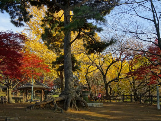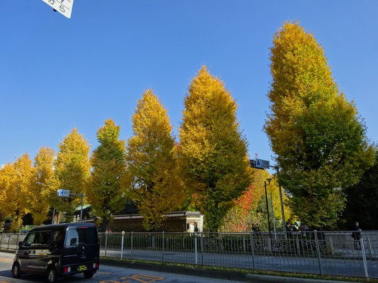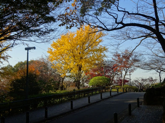 梅林ではいちょうの黄色ともみじの紅葉が隣り合ってます。記念館横の空き地の