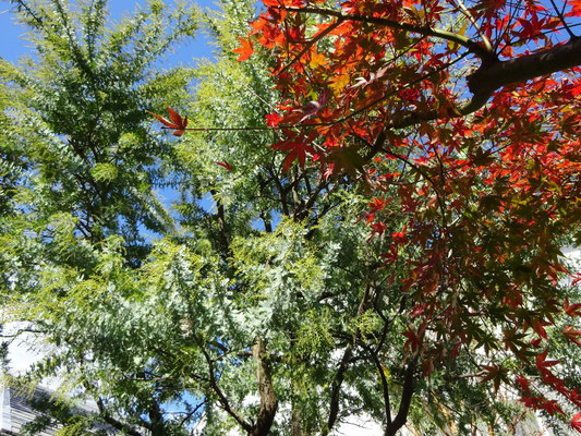 Roofの入り口にあるもみじもすっかり紅葉し来年の春に咲くうっすら黄色のミモザと並んで青空をバックに赤く映えています。