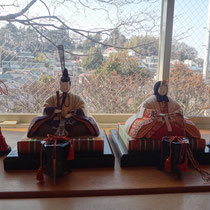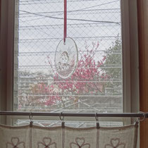 窓辺の花はアンズとボケで入り口には桃とモクレンです。