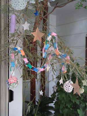 近所から取ってきた笹に少しづつ七夕飾りをしてきましたが毎日雨です。