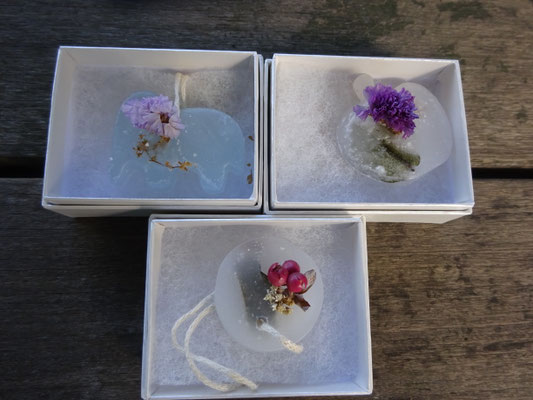 ボタニカルプレートは蝋にハーブをのせたもので精油を塗って