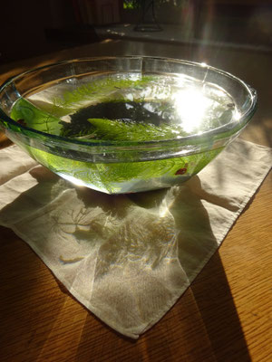 テーブルの上にある鉢の中のメダカが泳ぐ影がテーブルに映り