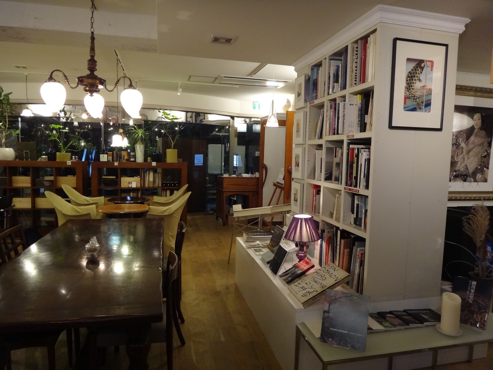 お茶の水にあるブック カフェ 静かな駿河台のビルの地下にありますが坂の途中にある ビルなので外にテラス席があり緑も見え 沢山の本に囲まれゆっくりお茶が出来ます。 デザイン会社が経営しているのでデザイン関係の本や パリ関係の本が多くお店の雰囲気もパリ風で大人が楽しめる空間です。