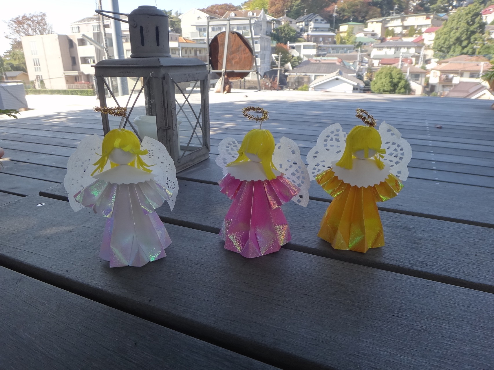 お店で折り紙のツリーをお教えしておりますが お客様から紙で作った天使を頂ました。 天使の輪が可愛い3人の天使が クリスマスまでおりますのでご覧下さい。