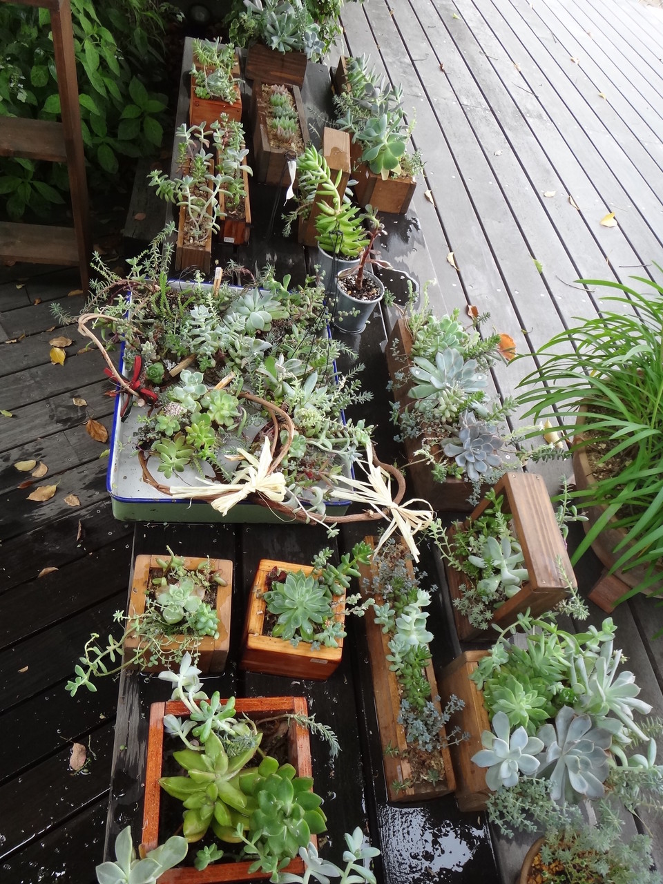 多肉植物には1か月に2回水やりをしています。 1日と15日と決めていてその前後の都合のいい日に デッキに全部の多肉植物を並べたっぷり水をあげます。 小さな物はバットに水を貯めその中に漬けてしばらくおいておきます。 これで半月は手間が要らないので助かります。