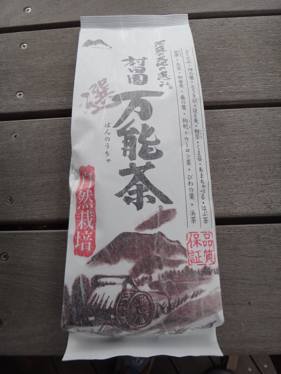 熊本県阿蘇から取り寄せしている万能茶はノンカフェインのお茶です。 どくだみ・柿の葉・とうきび・はと麦・.甜茶・くま笹・あまちゃづる・ はぶ茶・甘草・大豆・田舎麦・桑の葉・クコ・ウーロン茎・びわの葉・浜茶 が入ったお茶ですが大変飲みやすいです。