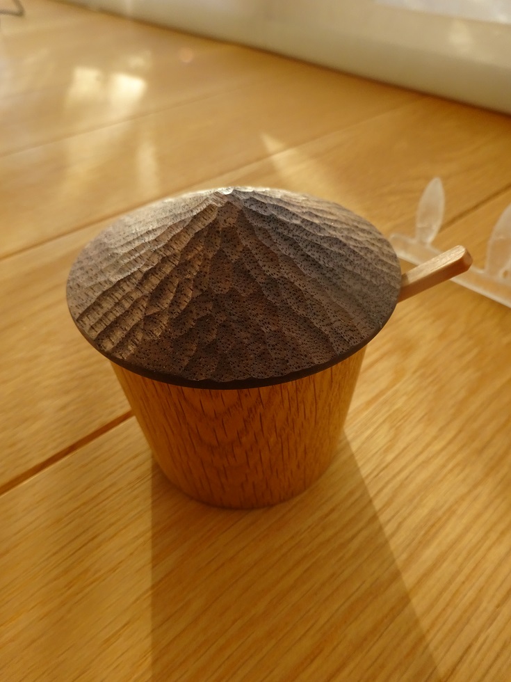もりのことで見つけたのは木のお家型砂糖入れと からむしの葉を挟んだ木の葉のブローチ