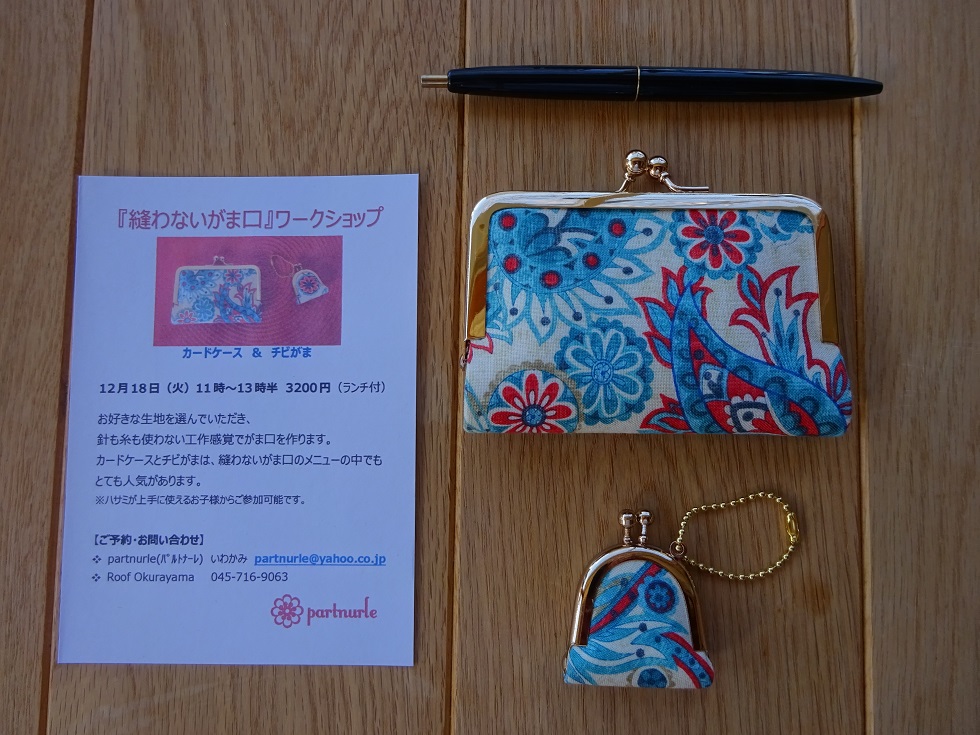 12月18日(火)11時~13時半 ランチ付き カードケースとチビがま 3200円 材料費・ワッフルランチ込 用意した生地の中からお好きな生地を選んで頂いても 又はお気に入りの生地や思い出の生地で作っても 他には無い自分だけの品になります。