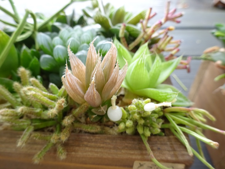 多肉植物寄せ植えの一つに白い球がついているのに 気が付きました。 半透明の美しい球です。 実かな?と思いますがはっきりとは判りません。