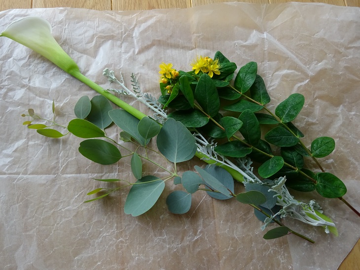 お庭で咲いたお花を頂きました。 カラー・しろたえ・ヒペリカム・ユーカリ 緑のグラデーションが美しいです。