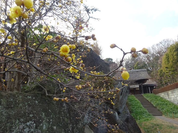 港北区新羽にある西方寺のロウバイを見てきました。 蝋のような半透明な黄色い花びらに黒い筋があり いい香りがします。 今週末頃が見頃になります。