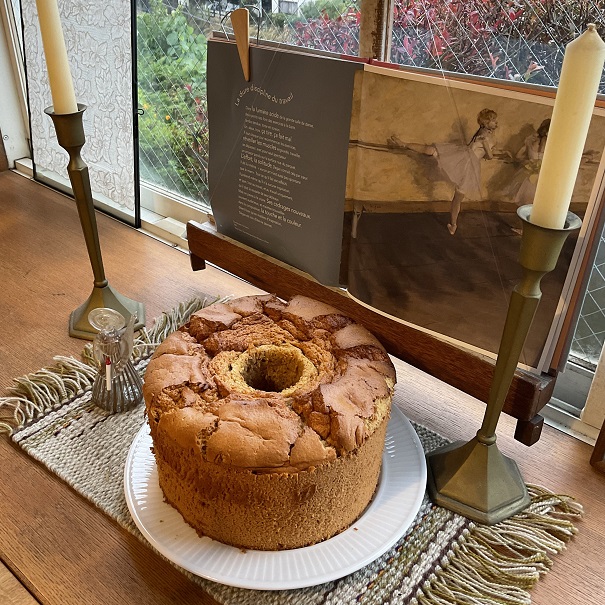 季節のシフォンケーキ焼いています。 黒糖のシフォンケーキ ほうじ茶とホワイトチョコレート あります。