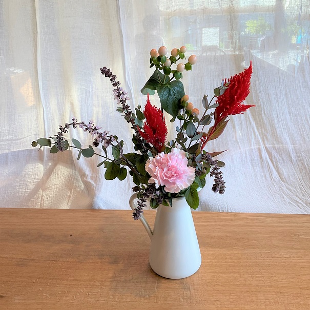 花材にバジルのお花がありました。 ルーフでもバジルを育てて使っていますが お花を咲かせると葉が固くなるそうで咲く前に切ったほうが いいそうです。