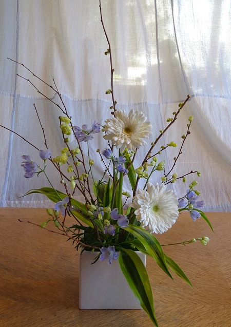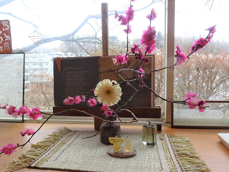 お花のワークショップで先生が生けた梅の花が 満開で窓辺に春を感じます。