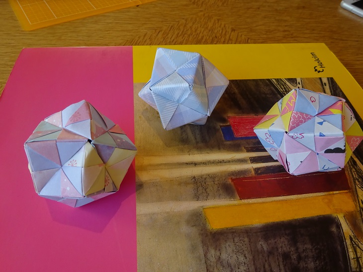 親戚の小学校2年生の子に折り紙のくす玉を習いました。 12枚の折り紙を組み立てますが組み立て方が 理解出来ずやっているうちに出来る感じです。