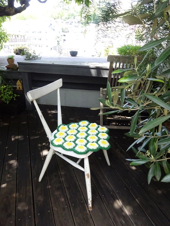 先週編物ワークショップ開催しました。 生徒さんが完成した作品を持って来てくださいました。 花の模様が可愛くて座れない座布団です。
