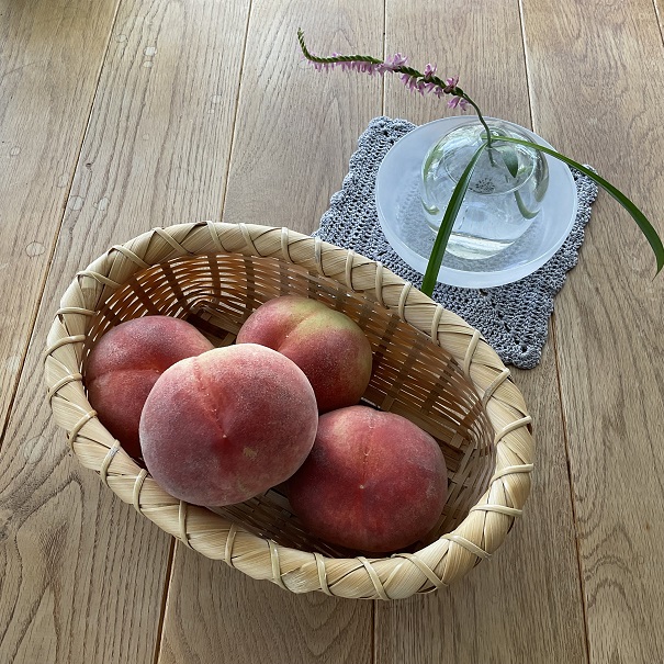 山梨の桃を食べました。 桃も種類によって収穫の時期が違うそうですが 白桃は今が旬です。白桃と言っても白より赤い 桃です。梅雨が明けて暑いですがみずみずしい桃は 夏のごちそうです。