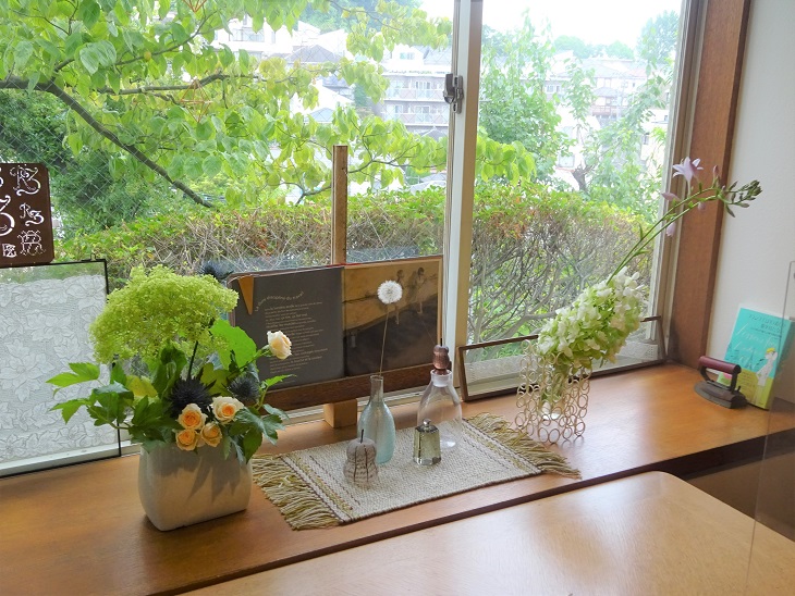 お花のワークショップは先生が見本で 生けて下さいます。 窓辺は夏の花で爽やかです。
