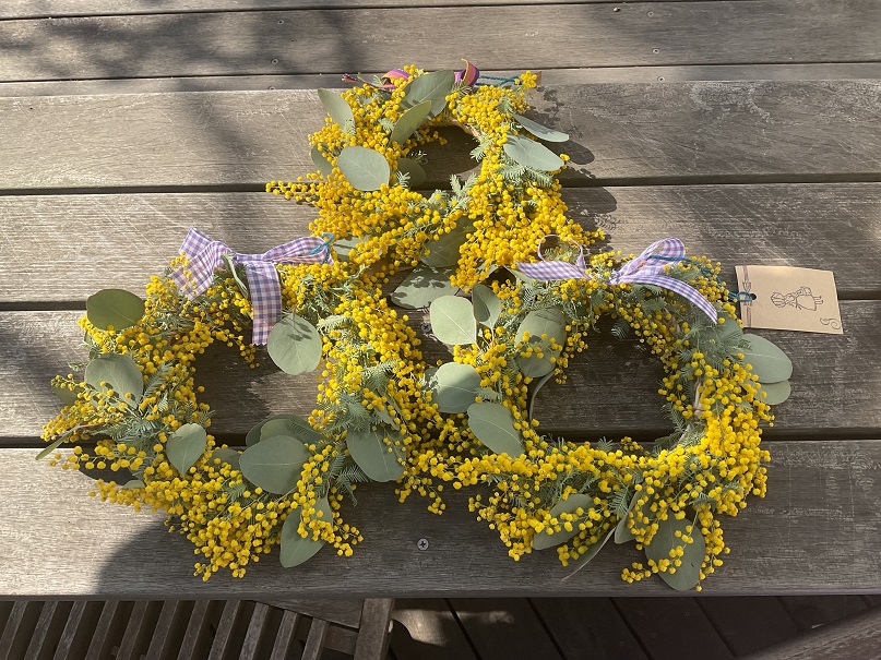 ミモザの季節です。 ミモザのリース入荷しています。 ルーフのミモザは元気がないので お客様のお庭のミモザでリースを作って頂きました。