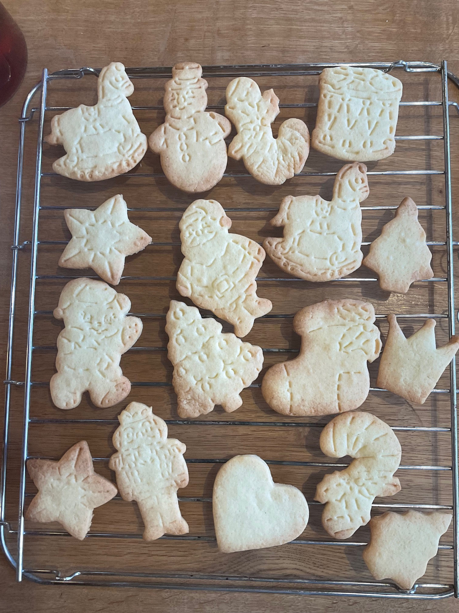 家族でクリスマス クッキーの生地を前日に仕込み 孫達に型抜きさせました。 型はお借りしたもので オーナメントとしてツリーに飾るそうですが 皆ですぐ食べてしまいました。