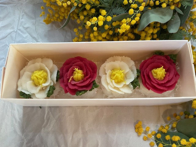 おはぎの上に天然色素で着色した白あんを使って ツバキの花を作ります。 初めてでも上手に完成してお持ち帰りされました。