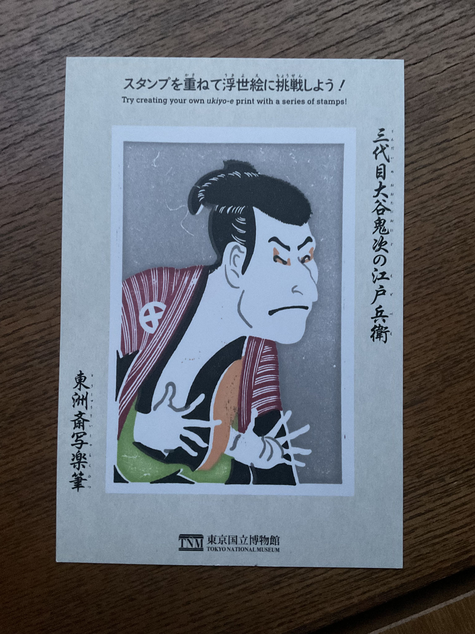 東博で浮世絵を刷る体験出来るコーナーがあり シャチハタの版が色ごとに並んでいて順番に押して 行くと完成しました。