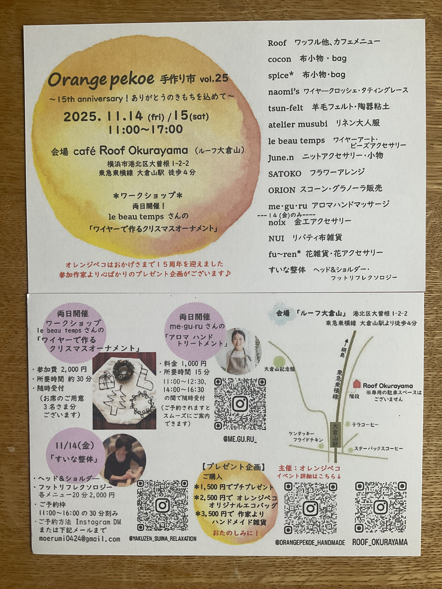11月14日(金)15日(土) オレンジペコさんの手作り市開催します。 沢山の作家さん達の手作り品を販売の他 ワークショップも開催します。 当日参加もお受けいたします。 ルーフもテイクアウトでワッフル、ケーキ、 ドリンクの販売を致します。