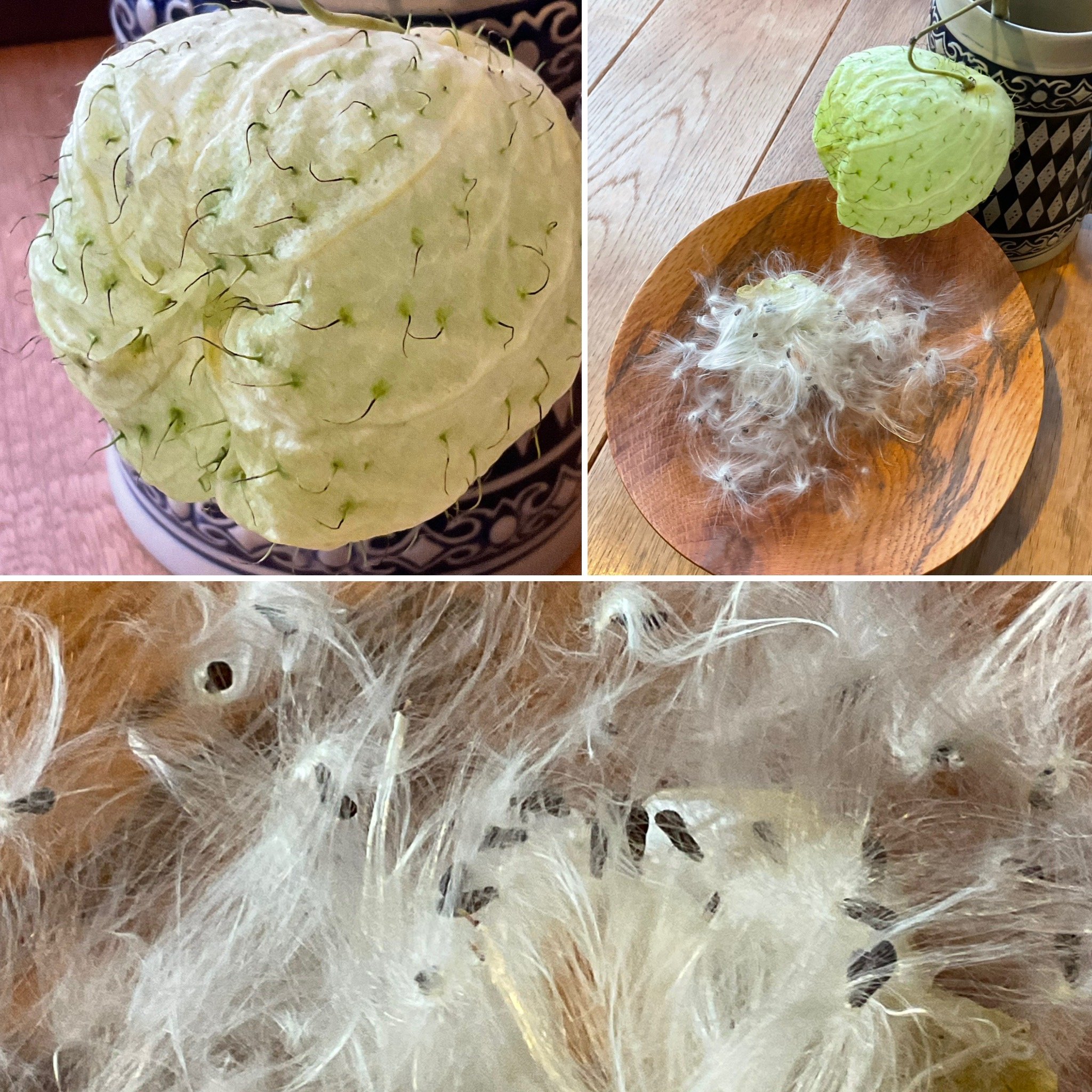 フセントウワタが弾けタネが出来ました。 シルクの様な毛が付いた種が沢山出てきました。