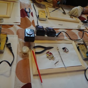 先生の指導の元ハンダ付けでガラスを繋げてペンダントやブローチに仕上げ