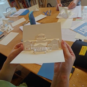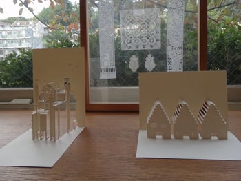 絵本の間にRoofでワークショップを開催している折り紙建築のカードも