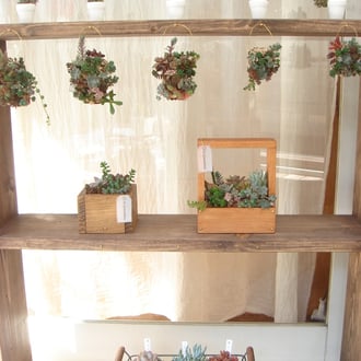 小さな植木鉢に寄せ植えされたミニチュアの様な物からオリジナルの木の器に寄せ植えされた物・壁に吊るしても可愛い寄せ植えと様々な