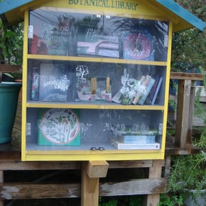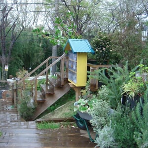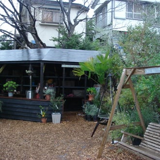 人工的な小屋・ブランコ・あずまやなど所々に配し様々な植物と