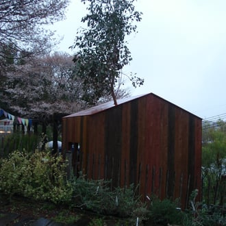 道具類が並び傾斜地の外部は楽しい仕掛けがあちこちにあり