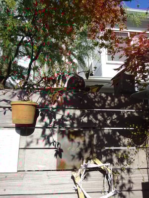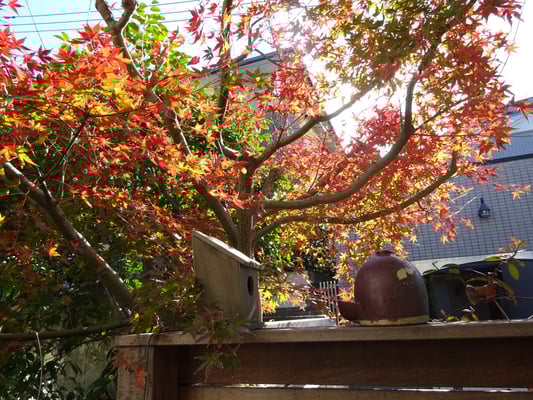 Roofの入り口にあるもみじもすっかり紅葉し来年の春に咲くうっすら黄色のミモザと並んで青空をバックに赤く映えています。