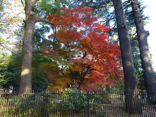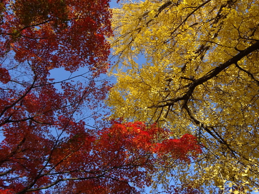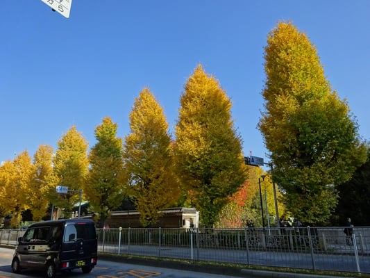 梅林ではいちょうの黄色ともみじの紅葉が隣り合ってます。記念館横の空き地の