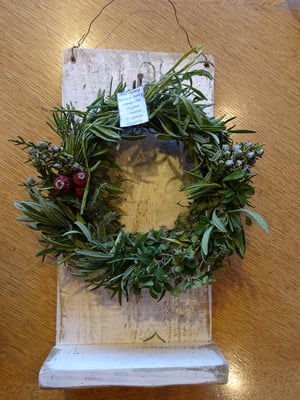 ハーブリースのワークショップが開催されローズマリー・ラベンダー・オレガノ・タイム・ジュニパーベリー・ローズヒップ・ミモザを使ったリースを作りました。