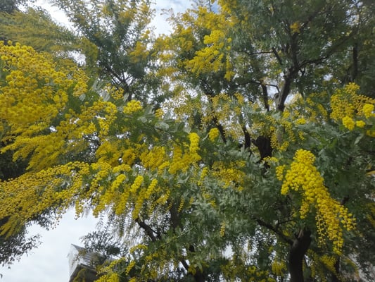 ミモザは見頃になり黄色の花がたわわです。