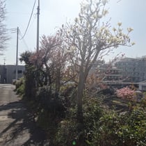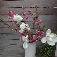窓辺の花はアンズとボケで入り口には桃とモクレンです。