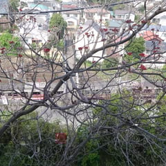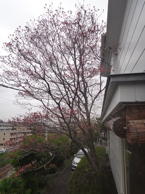 枝の先の花芽が濃いピンクになって上の方は開き始めてます。