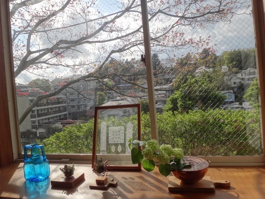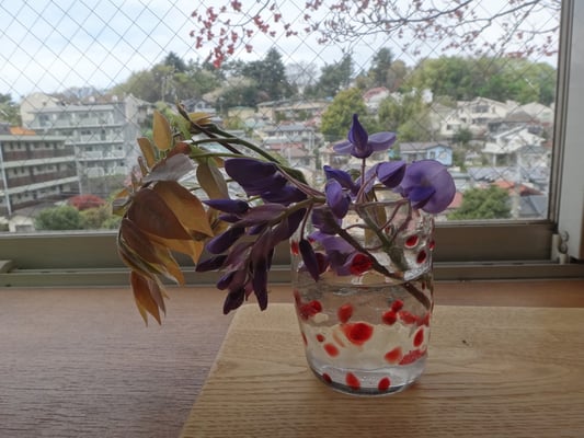 外のはなみずきが映り思いもかけない美しい写真になりました。