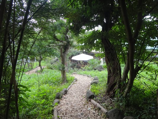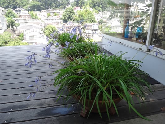あちこちでアガパンサスが咲いています。Roofに咲いているのはミニアガパンサスです。涼しげなブルーの花が店内からも見る事ができます。時々ちょうちょがやってきて蜜を吸っています。梅雨の晴れ間に見にいらして下さい。