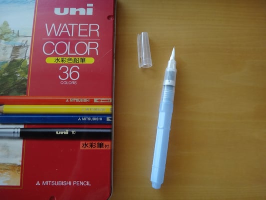 用意してあります。先日銀座の伊東屋で水を入れて使う筆ペンを見つけました。水彩色鉛筆で塗った後この筆ペンでなぞると色が滲み薄くなり水彩画の様になります。使ってみて下さい。