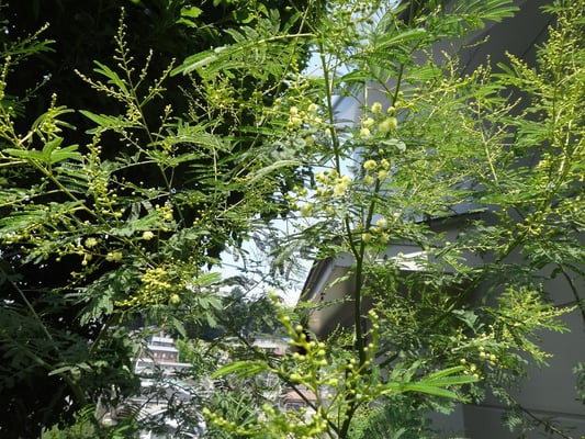 Roofには3月に真っ黄色に咲くミモザの他にアカシアデアネイと言う植木鉢に植わったミモザがあります。葉が繊細で美しいのが気に入ってますが今薄黄色の可愛い花が咲いています。華やかさはありませんが可憐な花をご覧下さい。