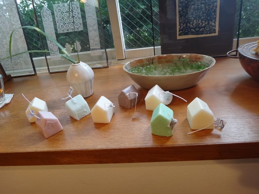 空気を浄化する大豆油(ソイワックス)でお家の形のキャンドルを作って頂きました。牛乳パックで家の形を作りお好きな色を付けたロウを流し込み冷やし固めます。やさしい色のお家のキャンドルが出来ました。