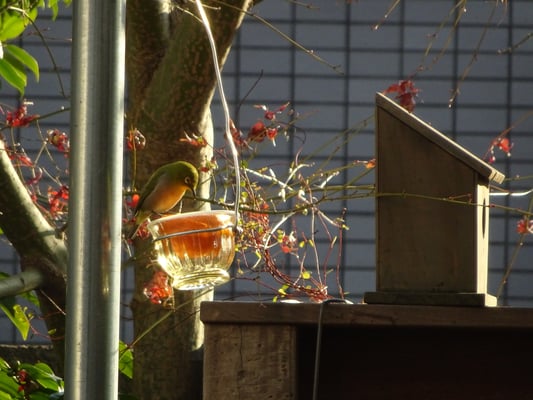 毎年冬になるとメジロやシジュウカラなど野鳥がやって来るのでヒマワリの種や砂糖水、みかんを庭に用意します。