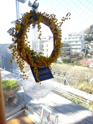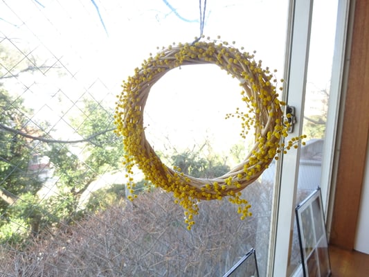 そのミモザで小さなリースを二つ作り店内に飾りました。