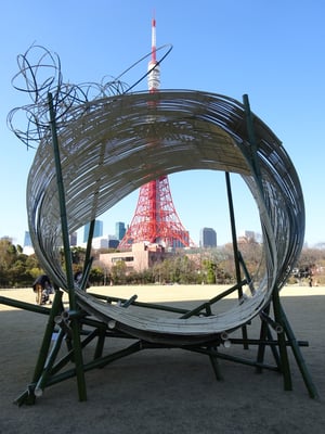 場所の東京プリンスパークタワー隣接公園は東京タワーがよく見える絶好の場所で竹を組んだ大きなオブジェはいけばなというより東京タワーを取り込んだ現代アートのようでした。