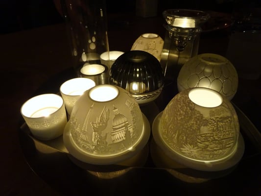 キャンドルの火に浮かび上がったパリの景色やモネの庭が美しく非日常を感じ