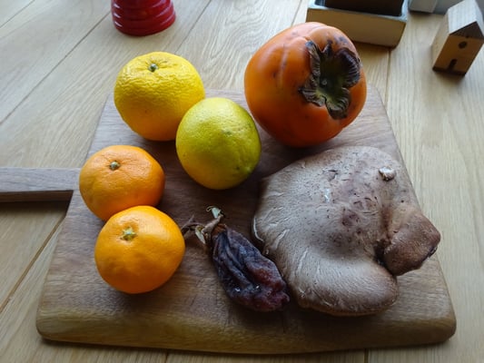 夏に美しい白い花を咲かせたカラスウリの実がなりました。