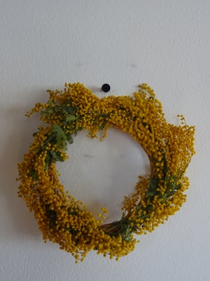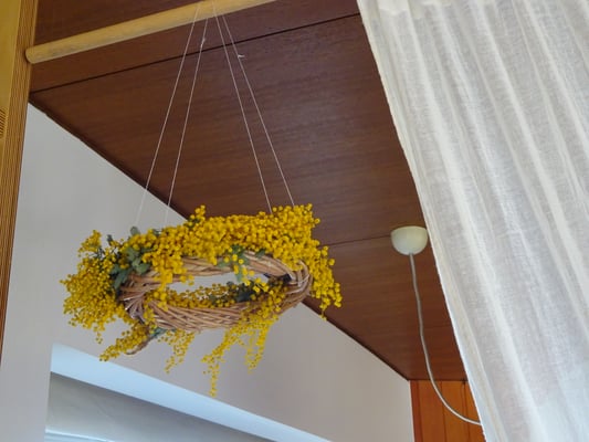 ルーフの入口に飾りました。上には黄色いミモザ足元にはピンクの桃を